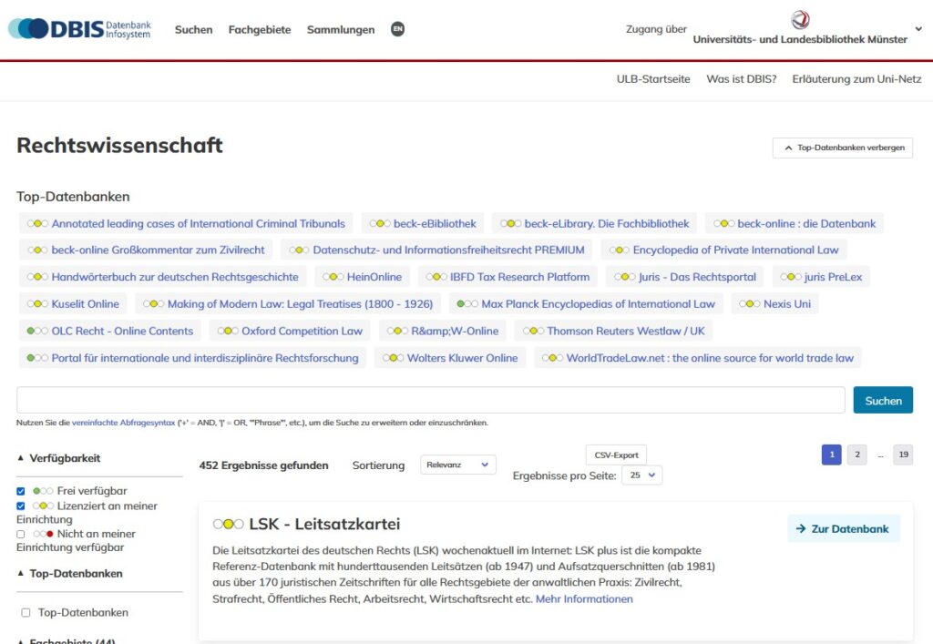 Sie möchten nach Datenbanken suchen, die für Ihrer Literaturrecherche interessant sein könnten? DBIS (Datenbank-Infosystem) bietet Ihnen die Suche nach Titeln oder thematische Auflistungen von Datenbanken (z. Bsp. Rechtswissenschaft). Anhand der farblichen Darstellung wird die Verfügbarkeit an der Universität Münster lizenzpflichtiger (gelb) und frei zugänglicher (grün) Quellen schnell ersichtlich.