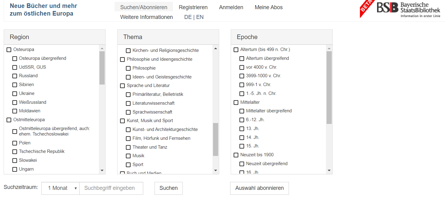 Screent des Neuerwerbungsdienstes Östliches Europa der BSB München, Stand 22.1.2020 (https://neuerwerbungen.bsb-muenchen.de/ned/newsearch?view=oe)